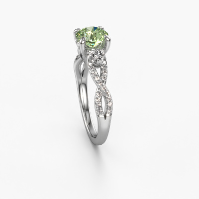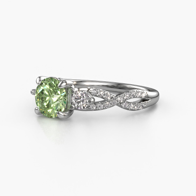 This platinum ring is called Marilou RND and is set with 6.5 mm green lab grown diamond. This exclusive platinum 3-stone engagement ring is a true work of art! The ornaments are crafted with a lot of patience and great passion. In order to create this ring with great precision, this craft requires a keen eye and skilful hand. A challenge which ignites a fire in our expert goldsmith. The exquisite green lab grown diamonds are set in a special way so they stand out even more. This gives the ring an even more glamorous appearance. The split band engagement ring is actually unique on its own because of the gemstones which we carefully select especially for this ring. On top of that you select the precious metals which will be used to create a unique ring for the most extraordinary woman in your life! This jewel is made just for you, with attention to detail and design.Are you on a budget? Please feel free to contact us, so we can go discuss your options. We offer our engagement rings at guaranteed best price, because we make them to order. You won't find such a price anywhere else!Have you found a specific engagement ring somewhere which you would like to give to your loved one? Please feel free to express your wishes to our jewel designers because we would be honoured to turn your design into a fantasy engagement ring. You can follow the development of your ring design because we use 3D drawings. This gives you a realistic preview of how your design will look. You can also preorder a dummy. A dummy is a plastic ring, which can be shaped according your ring design. You can try it on and check if its width and size are suitable for you. We will gladly send you a non-binding offer, based on a fair price/ quality ratio. It will amaze you, considering the quality of the ring and gemstones.To make it easier for you, we offer a 30 day return policy. Check our terms and conditions.