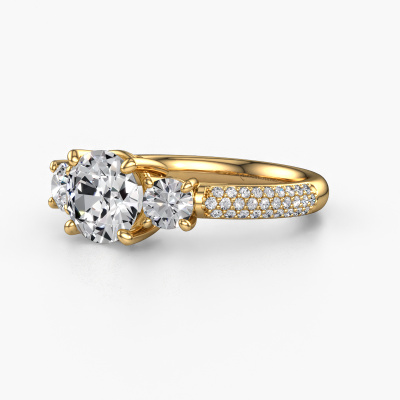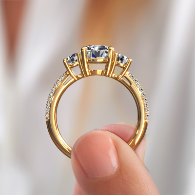 This 14 Carat gold ring is called Marielle RND and is set with 2.17 crt lab grown diamond. This exclusive gold 3-stone engagement ring is a true work of art! The ornaments are crafted with a lot of patience and great passion. In order to create this ring with great precision, this craft requires a keen eye and skilful hand. A challenge which ignites a fire in our expert goldsmith. The exquisite lab-grown diamonds are set in a special way so they stand out even more. This gives the ring an even more glamorous appearance. The tasteful engagement ring is actually unique on its own because of the gemstones which we carefully select especially for this ring. On top of that you select the precious metals which will be used to create a unique ring for the most extraordinary woman in your life! This jewel is made with passion and love by one of our master goldsmiths.By using a combination of the latest modern techniques, combined with ancient crafting, we can make all our engagement rings in our own studio. Each jewel is made to order. This is advantageous because we can offer you a price you won't find anywhere else.Our designers and goldsmiths work together each day, creating new jewels. Perhaps you have found a nice exclusive engagement ring somewhere, which can be used to customize your unique ring. Please feel free to contact us. We will make you an offer, based on a fair price/ quality ratio, which will amaze you.To make it easier for you, we offer a 30 day return policy. Check our terms and conditions.
