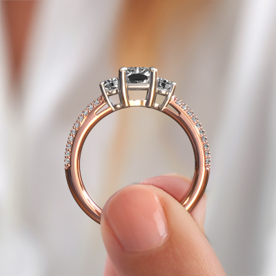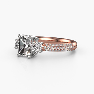 This 14 Carat rose gold ring is called Marielle RAD and is set with 1.67 crt lab grown diamond. This exclusive rose gold 3-stone engagement ring is a true work of art! The ornaments are crafted with a lot of patience and great passion. In order to create this ring with great precision, this craft requires a keen eye and skilful hand. A challenge which ignites a fire in our expert goldsmith. The exquisite lab-grown diamonds are set in a special way so they stand out even more. This gives the ring an even more glamorous appearance. The graceful engagement ring is actually unique on its own because of the gemstones which we carefully select especially for this ring. On top of that you select the precious metals which will be used to create a unique ring for the most extraordinary woman in your life! This jewel is created to add sparkle to your finger, each jewel is lovingly made by hand by our goldsmiths.By using a combination of the latest modern techniques, combined with ancient crafting, we can make all our engagement rings in our own studio. Each jewel is made to order. This is advantageous because we can offer you a price you won't find anywhere else.Different styles of new rings are made daily by our team. Perhaps you have found a 3-stone engagement ring somewhere. One you would like to give to your loved one. Please feel free to share your thoughts and design with our jewel designers. We would love to turn your design into a contemporary engagement ring. You can follow the development of your ring design because we use very detailed 3D drawings. On top of that, you can order a dummy of the design. A dummy is a plastic ring, which can be shaped according your ring design. You can try it on and check if the engagement ring is up to standard. We will gladly send you a non-binding offer, based on a fair price/ quality ratio. The offer will baffle you, considering the quality of the ring and gemstones.To make it easier for you, we offer a 30 day return policy. Check our terms and conditions.