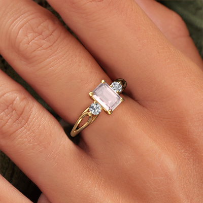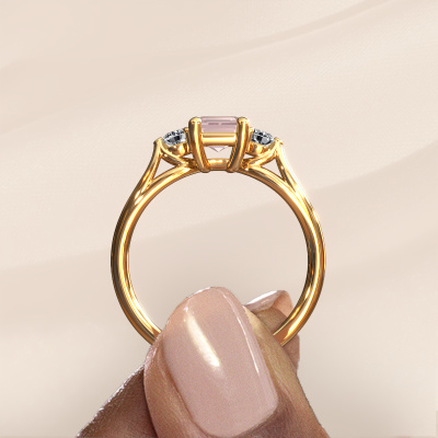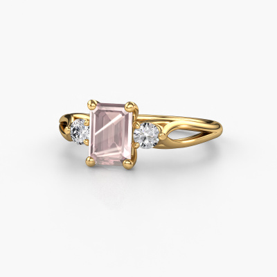 This 14 Carat gold ring is called Amie EME and is set with 7x5 mm morganite champagne. This exclusive gold 3-stone engagement ring is a true work of art! The ornaments are crafted with a lot of patience and great passion. In order to create this ring with great precision, this craft requires a keen eye and skilful hand. A challenge which ignites a fire in our expert goldsmith. The exquisite morganite champagne are set in a special way so they stand out even more. This gives the ring an even more glamorous appearance. The tasteful engagement ring is actually unique on its own because of the gemstones which we carefully select especially for this ring. On top of that you select the precious metals which will be used to create a unique ring for the most extraordinary woman in your life! This jewel is made to shine bright around your finger. Each jewel is hand made with love by our goldsmiths.Are you on a budget? Please feel free to contact us, so we can go discuss your options. We offer our engagement rings at guaranteed best price, because we make them to order. You won't find such a price anywhere else!Our team adds new designs to our online collection daily. Our designers and goldsmiths work together in creating the best design. We strive to offer a diverse collection of jewels. Perhaps you have a specific jewel design in mind. One you came across somewhere. Please contact us for a free consultation. We will make you an offer, based on a fair price/ quality ratio, that will baffle you.To make it easier for you, we offer a 30 day return policy. Check our terms and conditions.