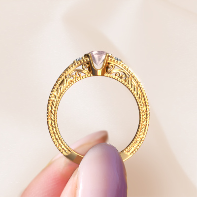 This 14 Carat gold ring is called Anamaria and is set with 5 mm morganite champagne. An extraordinary gold vintage ring. One that will surely make the love of your life shine like a diamond! That is what we hope to achieve. This vintage engagement ring is set with exquisite morganite champagne. Whichever gemstone you choose from our selection, is up to you. The gemstone is selected with great care because we believe your filigree engagement ring must be adorned with nothing but the most beautiful gemstone. Wouldn't you agree? Our expert goldsmith will design your ring in our own crafting studio, where the morganite champagne will be set with great precision. The ring will then be polished till it shines perfectly. Nothing but the best for the love of your life! This jewel is made just for you by our master goldsmiths in our own studio.Are you on a budget? Please feel free to contact us, so we can go discuss your options. We offer our engagement rings at guaranteed best price, because we make them to order. You won't find such a price anywhere else!Our team adds new designs to our online collection daily. Our designers and goldsmiths work together in creating the best design. We strive to offer a diverse collection of jewels. Perhaps you have a specific jewel design in mind. One you came across somewhere. Please contact us for a free consultation. We will make you an offer, based on a fair price/ quality ratio, that will baffle you.To make it easier for you, we offer a 30 day return policy. Check our terms and conditions.