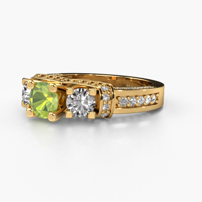 This 14 Carat gold ring is called Phileine and is set with 5 mm peridot. This exclusive gold 3-stone engagement ring is a true work of art! The ornaments are crafted with a lot of patience and great passion. In order to create this ring with great precision, this craft requires a keen eye and skilful hand. A challenge which ignites a fire in our expert goldsmith. The exquisite peridot are set in a special way so they stand out even more. This gives the ring an even more glamorous appearance. The daring engagement ring is actually unique on its own because of the gemstones which we carefully select especially for this ring. On top of that you select the precious metals which will be used to create a unique ring for the most extraordinary woman in your life! This jewel is made with passion and love by one of our master goldsmiths.After receiving your order, our goldsmiths will passionately start the creative process of making your engagement ring in our own studio. Because we don't have a big stockpile, these costs will not be passed on to you. Our pricing is proof of that! We offer top quality jewels at lowest price, guaranteed.Different styles of new rings are made daily by our team. Perhaps you have found a 3-stone engagement ring somewhere. One you would like to give to your loved one. Please feel free to share your thoughts and design with our jewel designers. We would love to turn your design into a exclusive engagement ring. You can follow the development of your ring design because we use very detailed 3D drawings. On top of that, you can order a dummy of the design. A dummy is a plastic ring, which can be shaped according your ring design. You can try it on and check if the engagement ring is up to standard. We will gladly send you a non-binding offer, based on a fair price/ quality ratio. The offer will baffle you, considering the quality of the ring and gemstones.To make it easier for you, we offer a 30 day return policy. Check our terms and conditions.