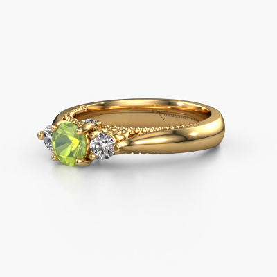 This 14 Carat gold ring is called Tiffani and is set with 5 mm peridot. This exclusive gold 3-stone engagement ring is a true work of art! The ornaments are crafted with a lot of patience and great passion. In order to create this ring with great precision, this craft requires a keen eye and skilful hand. A challenge which ignites a fire in our expert goldsmith. The exquisite peridot are set in a special way so they stand out even more. This gives the ring an even more glamorous appearance. The ajour engagement ring is actually unique on its own because of the gemstones which we carefully select especially for this ring. On top of that you select the precious metals which will be used to create a unique ring for the most extraordinary woman in your life! This jewel is made just for you by our master goldsmiths in our own studio.After receiving your order, our goldsmiths will passionately start the creative process of making your engagement ring in our own studio. Because we don't have a big stockpile, these costs will not be passed on to you. Our pricing is proof of that! We offer top quality jewels at lowest price, guaranteed.Have you found a specific engagement ring somewhere which you would like to give to your loved one? Please feel free to express your wishes to our jewel designers because we would be honoured to turn your design into a unique engagement ring. You can follow the development of your ring design because we use 3D drawings. This gives you a realistic preview of how your design will look. You can also preorder a dummy. A dummy is a plastic ring, which can be shaped according your ring design. You can try it on and check if its width and size are suitable for you. We will gladly send you a non-binding offer, based on a fair price/ quality ratio. It will amaze you, considering the quality of the ring and gemstones.To make it easier for you, we offer a 30 day return policy. Check our terms and conditions.