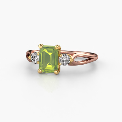 This 14 Carat rose gold ring is called Amie EME and is set with 7x5 mm peridot. This exclusive rose gold 3-stone engagement ring is a true work of art! The ornaments are crafted with a lot of patience and great passion. In order to create this ring with great precision, this craft requires a keen eye and skilful hand. A challenge which ignites a fire in our expert goldsmith. The exquisite peridot are set in a special way so they stand out even more. This gives the ring an even more glamorous appearance. The tasteful engagement ring is actually unique on its own because of the gemstones which we carefully select especially for this ring. On top of that you select the precious metals which will be used to create a unique ring for the most extraordinary woman in your life! This jewel is made to shine bright around your finger. Each jewel is hand made with love by our goldsmiths.Are you on a budget? Please feel free to contact us, so we can go discuss your options. We offer our engagement rings at guaranteed best price, because we make them to order. You won't find such a price anywhere else!Our team adds new designs to our online collection daily. Our designers and goldsmiths work together in creating the best design. We strive to offer a diverse collection of jewels. Perhaps you have a specific jewel design in mind. One you came across somewhere. Please contact us for a free consultation. We will make you an offer, based on a fair price/ quality ratio, that will baffle you.To make it easier for you, we offer a 30 day return policy. Check our terms and conditions.