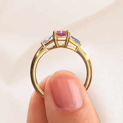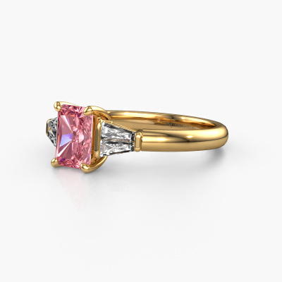 This 14 Carat gold ring is called Kina RAD and is set with 7x5 mm pink lab grown diamond. This exclusive gold 3-stone engagement ring is a true work of art! The ornaments are crafted with a lot of patience and great passion. In order to create this ring with great precision, this craft requires a keen eye and skilful hand. A challenge which ignites a fire in our expert goldsmith. The exquisite pink lab grown diamonds are set in a special way so they stand out even more. This gives the ring an even more glamorous appearance. The graceful engagement ring is actually unique on its own because of the gemstones which we carefully select especially for this ring. On top of that you select the precious metals which will be used to create a unique ring for the most extraordinary woman in your life! This jewel is made just for you, with attention to detail and design.After receiving your order, our goldsmiths will passionately start the creative process of making your engagement ring in our own studio. Because we don't have a big stockpile, these costs will not be passed on to you. Our pricing is proof of that! We offer top quality jewels at lowest price, guaranteed.Have you found a specific engagement ring somewhere which you would like to give to your loved one? Please feel free to express your wishes to our jewel designers because we would be honoured to turn your design into a unique engagement ring. You can follow the development of your ring design because we use 3D drawings. This gives you a realistic preview of how your design will look. You can also preorder a dummy. A dummy is a plastic ring, which can be shaped according your ring design. You can try it on and check if its width and size are suitable for you. We will gladly send you a non-binding offer, based on a fair price/ quality ratio. It will amaze you, considering the quality of the ring and gemstones.To make it easier for you, we offer a 30 day return policy. Check our terms and conditions.