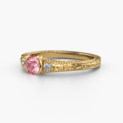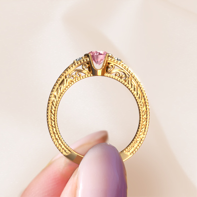 This 14 Carat gold ring is called Anamaria and is set with 5 mm pink lab grown diamond. An extraordinary gold vintage ring. One that will surely make the love of your life shine like a diamond! That is what we hope to achieve. This vintage engagement ring is set with exquisite pink lab grown diamond. Whichever gemstone you choose from our selection, is up to you. The gemstone is selected with great care because we believe your filigree engagement ring must be adorned with nothing but the most beautiful gemstone. Wouldn't you agree? Our expert goldsmith will design your ring in our own crafting studio, where the pink lab grown diamond will be set with great precision. The ring will then be polished till it shines perfectly. Nothing but the best for the love of your life! This jewel is made just for you by our master goldsmiths in our own studio.Are you on a budget? Please feel free to contact us, so we can go discuss your options. We offer our engagement rings at guaranteed best price, because we make them to order. You won't find such a price anywhere else!Our team adds new designs to our online collection daily. Our designers and goldsmiths work together in creating the best design. We strive to offer a diverse collection of jewels. Perhaps you have a specific jewel design in mind. One you came across somewhere. Please contact us for a free consultation. We will make you an offer, based on a fair price/ quality ratio, that will baffle you.To make it easier for you, we offer a 30 day return policy. Check our terms and conditions.