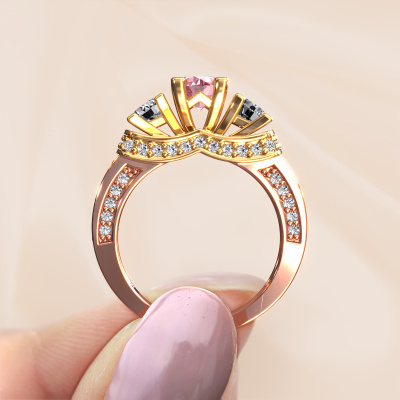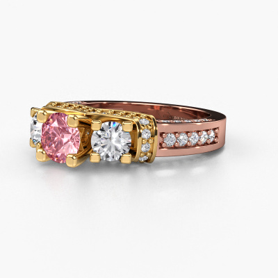 This 14 Carat rose gold ring is called Phileine and is set with 5 mm pink lab grown diamond. This exclusive rose gold 3-stone engagement ring is a true work of art! The ornaments are crafted with a lot of patience and great passion. In order to create this ring with great precision, this craft requires a keen eye and skilful hand. A challenge which ignites a fire in our expert goldsmith. The exquisite pink lab grown diamonds are set in a special way so they stand out even more. This gives the ring an even more glamorous appearance. The daring engagement ring is actually unique on its own because of the gemstones which we carefully select especially for this ring. On top of that you select the precious metals which will be used to create a unique ring for the most extraordinary woman in your life! This jewel is made with passion and love by one of our master goldsmiths.After receiving your order, our goldsmiths will passionately start the creative process of making your engagement ring in our own studio. Because we don't have a big stockpile, these costs will not be passed on to you. Our pricing is proof of that! We offer top quality jewels at lowest price, guaranteed.Different styles of new rings are made daily by our team. Perhaps you have found a 3-stone engagement ring somewhere. One you would like to give to your loved one. Please feel free to share your thoughts and design with our jewel designers. We would love to turn your design into a exclusive engagement ring. You can follow the development of your ring design because we use very detailed 3D drawings. On top of that, you can order a dummy of the design. A dummy is a plastic ring, which can be shaped according your ring design. You can try it on and check if the engagement ring is up to standard. We will gladly send you a non-binding offer, based on a fair price/ quality ratio. The offer will baffle you, considering the quality of the ring and gemstones.To make it easier for you, we offer a 30 day return policy. Check our terms and conditions.