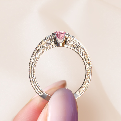 This 14 Carat white gold ring is called Anamaria and is set with 5 mm pink lab grown diamond. An extraordinary white gold vintage ring. One that will surely make the love of your life shine like a diamond! That is what we hope to achieve. This vintage engagement ring is set with exquisite pink lab grown diamond. Whichever gemstone you choose from our selection, is up to you. The gemstone is selected with great care because we believe your filigree engagement ring must be adorned with nothing but the most beautiful gemstone. Wouldn't you agree? Our expert goldsmith will design your ring in our own crafting studio, where the pink lab grown diamond will be set with great precision. The ring will then be polished till it shines perfectly. Nothing but the best for the love of your life! This jewel is made just for you by our master goldsmiths in our own studio.Are you on a budget? Please feel free to contact us, so we can go discuss your options. We offer our engagement rings at guaranteed best price, because we make them to order. You won't find such a price anywhere else!Our team adds new designs to our online collection daily. Our designers and goldsmiths work together in creating the best design. We strive to offer a diverse collection of jewels. Perhaps you have a specific jewel design in mind. One you came across somewhere. Please contact us for a free consultation. We will make you an offer, based on a fair price/ quality ratio, that will baffle you.To make it easier for you, we offer a 30 day return policy. Check our terms and conditions.