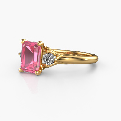 This 14 Carat gold ring is called Laurian EME and is set with 8x6 mm pink sapphire. This exclusive gold 3-stone engagement ring is a true work of art! The ornaments are crafted with a lot of patience and great passion. In order to create this ring with great precision, this craft requires a keen eye and skilful hand. A challenge which ignites a fire in our expert goldsmith. The exquisite pink sapphire are set in a special way so they stand out even more. This gives the ring an even more glamorous appearance. The special engagement ring is actually unique on its own because of the gemstones which we carefully select especially for this ring. On top of that you select the precious metals which will be used to create a unique ring for the most extraordinary woman in your life! This jewel is unique in every way! Simply customize to your liking,By using a combination of the latest modern techniques, combined with ancient crafting, we can make all our engagement rings in our own studio. Each jewel is made to order. This is advantageous because we can offer you a price you won't find anywhere else.Our team adds new designs to our online collection daily. Our designers and goldsmiths work together in creating the best design. We strive to offer a diverse collection of jewels. Perhaps you have a specific jewel design in mind. One you came across somewhere. Please contact us for a free consultation. We will make you an offer, based on a fair price/ quality ratio, that will baffle you.To make it easier for you, we offer a 30 day return policy. Check our terms and conditions.