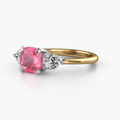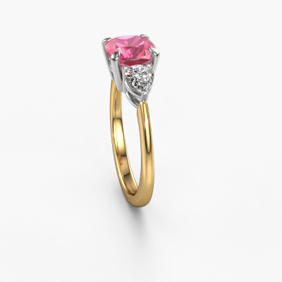 This 14 Carat gold ring is called Chanou CUS and is set with 7 mm pink sapphire. This exclusive gold 3-stone engagement ring is a true work of art! The ornaments are crafted with a lot of patience and great passion. In order to create this ring with great precision, this craft requires a keen eye and skilful hand. A challenge which ignites a fire in our expert goldsmith. The exquisite pink sapphire are set in a special way so they stand out even more. This gives the ring an even more glamorous appearance. The pretty engagement ring is actually unique on its own because of the gemstones which we carefully select especially for this ring. On top of that you select the precious metals which will be used to create a unique ring for the most extraordinary woman in your life! This jewel is made to shine bright around your finger. Each jewel is hand made with love by our goldsmiths.After receiving your order, our goldsmiths will start the creative process of making your Chanou CUS engagement ring. We don't keep stock. This is advantageous because these costs will not be passed on to you. Therefore, we can offer jewellery at exceptionally low prices.Our designers and goldsmiths work together each day, creating new jewels. Perhaps you have found a nice exclusive engagement ring somewhere, which can be used to customize your unique ring. Please feel free to contact us. We will make you an offer, based on a fair price/ quality ratio, which will amaze you.To make it easier for you, we offer a 30 day return policy. Check our terms and conditions.
