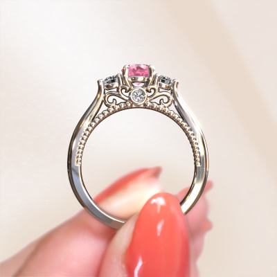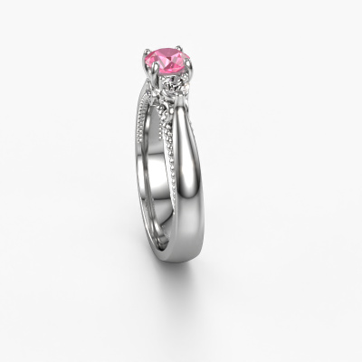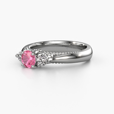 This platinum ring is called Tiffani and is set with 5 mm pink sapphire. This exclusive platinum 3-stone engagement ring is a true work of art! The ornaments are crafted with a lot of patience and great passion. In order to create this ring with great precision, this craft requires a keen eye and skilful hand. A challenge which ignites a fire in our expert goldsmith. The exquisite pink sapphire are set in a special way so they stand out even more. This gives the ring an even more glamorous appearance. The ajour engagement ring is actually unique on its own because of the gemstones which we carefully select especially for this ring. On top of that you select the precious metals which will be used to create a unique ring for the most extraordinary woman in your life! This jewel is made just for you by our master goldsmiths in our own studio.After receiving your order, our goldsmiths will passionately start the creative process of making your engagement ring in our own studio. Because we don't have a big stockpile, these costs will not be passed on to you. Our pricing is proof of that! We offer top quality jewels at lowest price, guaranteed.Have you found a specific engagement ring somewhere which you would like to give to your loved one? Please feel free to express your wishes to our jewel designers because we would be honoured to turn your design into a unique engagement ring. You can follow the development of your ring design because we use 3D drawings. This gives you a realistic preview of how your design will look. You can also preorder a dummy. A dummy is a plastic ring, which can be shaped according your ring design. You can try it on and check if its width and size are suitable for you. We will gladly send you a non-binding offer, based on a fair price/ quality ratio. It will amaze you, considering the quality of the ring and gemstones.To make it easier for you, we offer a 30 day return policy. Check our terms and conditions.