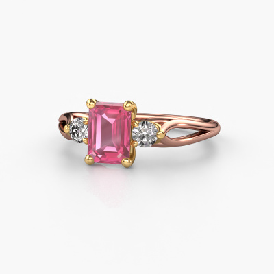 This 14 Carat rose gold ring is called Amie EME and is set with 7x5 mm pink sapphire. This exclusive rose gold 3-stone engagement ring is a true work of art! The ornaments are crafted with a lot of patience and great passion. In order to create this ring with great precision, this craft requires a keen eye and skilful hand. A challenge which ignites a fire in our expert goldsmith. The exquisite pink sapphire are set in a special way so they stand out even more. This gives the ring an even more glamorous appearance. The tasteful engagement ring is actually unique on its own because of the gemstones which we carefully select especially for this ring. On top of that you select the precious metals which will be used to create a unique ring for the most extraordinary woman in your life! This jewel is made to shine bright around your finger. Each jewel is hand made with love by our goldsmiths.Are you on a budget? Please feel free to contact us, so we can go discuss your options. We offer our engagement rings at guaranteed best price, because we make them to order. You won't find such a price anywhere else!Our team adds new designs to our online collection daily. Our designers and goldsmiths work together in creating the best design. We strive to offer a diverse collection of jewels. Perhaps you have a specific jewel design in mind. One you came across somewhere. Please contact us for a free consultation. We will make you an offer, based on a fair price/ quality ratio, that will baffle you.To make it easier for you, we offer a 30 day return policy. Check our terms and conditions.