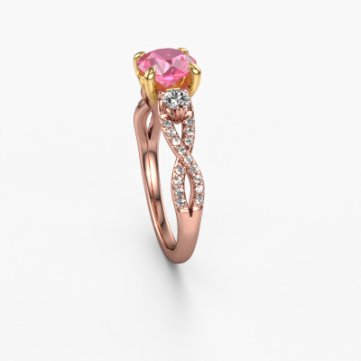 This 14 Carat rose gold ring is called Marilou RND and is set with 6.5 mm pink sapphire. This exclusive rose gold 3-stone engagement ring is a true work of art! The ornaments are crafted with a lot of patience and great passion. In order to create this ring with great precision, this craft requires a keen eye and skilful hand. A challenge which ignites a fire in our expert goldsmith. The exquisite pink sapphire are set in a special way so they stand out even more. This gives the ring an even more glamorous appearance. The split band engagement ring is actually unique on its own because of the gemstones which we carefully select especially for this ring. On top of that you select the precious metals which will be used to create a unique ring for the most extraordinary woman in your life! This jewel is made just for you, with attention to detail and design.Are you on a budget? Please feel free to contact us, so we can go discuss your options. We offer our engagement rings at guaranteed best price, because we make them to order. You won't find such a price anywhere else!Have you found a specific engagement ring somewhere which you would like to give to your loved one? Please feel free to express your wishes to our jewel designers because we would be honoured to turn your design into a fantasy engagement ring. You can follow the development of your ring design because we use 3D drawings. This gives you a realistic preview of how your design will look. You can also preorder a dummy. A dummy is a plastic ring, which can be shaped according your ring design. You can try it on and check if its width and size are suitable for you. We will gladly send you a non-binding offer, based on a fair price/ quality ratio. It will amaze you, considering the quality of the ring and gemstones.To make it easier for you, we offer a 30 day return policy. Check our terms and conditions.