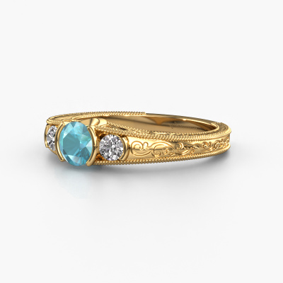This 14 Carat gold ring is called Tasia and is set with 5 mm blue topaz. Is your girlfriend hooked on vintage? Then this gold filigree promise ring will surely match her style perfectly. A trendy ring with just a hint of vintage adornment. A truly stunning, romantic design! Especially when you customize your ring to your own liking. This vintage 3-stone promise ring is set with stunning blue topaz. As you can see, you are the boss in selecting a gemstone which matches the style of your girlfriend best. Each gemstone is carefully selected by our merchants whom are spread throughout the world. Nothing but the best gems for our expert goldsmith. After all, it is his crowning glory! Each jewel is made with passion and love by one of our master goldsmiths.By using a combination of the latest modern techniques, combined with ancient crafting, we can make all our promise ring in our own studio. Each jewel is made to order. This is advantageous because we can offer you a price you won't find anywhere else.Our team adds new designs to our online collection daily. Our designers and goldsmiths work together in creating the best design. We strive to offer a diverse collection of jewels. Perhaps you have a specific jewel design in mind. One you came across somewhere. Please contact us for a free consultation. We will make you an offer, based on a fair price/ quality ratio, that will baffle you.To make it easier for you, we offer a 30 day return policy. Check our terms and conditions.