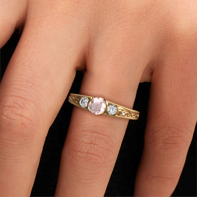 This 14 Carat gold ring is called Tasia and is set with 5 mm morganite champagne. Is your girlfriend hooked on vintage? Then this gold filigree promise ring will surely match her style perfectly. A trendy ring with just a hint of vintage adornment. A truly stunning, romantic design! Especially when you customize your ring to your own liking. This vintage 3-stone promise ring is set with stunning morganite champagne. As you can see, you are the boss in selecting a gemstone which matches the style of your girlfriend best. Each gemstone is carefully selected by our merchants whom are spread throughout the world. Nothing but the best gems for our expert goldsmith. After all, it is his crowning glory! Each jewel is made with passion and love by one of our master goldsmiths.By using a combination of the latest modern techniques, combined with ancient crafting, we can make all our promise ring in our own studio. Each jewel is made to order. This is advantageous because we can offer you a price you won't find anywhere else.Our team adds new designs to our online collection daily. Our designers and goldsmiths work together in creating the best design. We strive to offer a diverse collection of jewels. Perhaps you have a specific jewel design in mind. One you came across somewhere. Please contact us for a free consultation. We will make you an offer, based on a fair price/ quality ratio, that will baffle you.To make it easier for you, we offer a 30 day return policy. Check our terms and conditions.