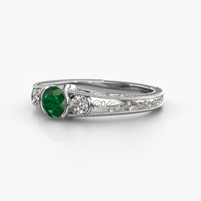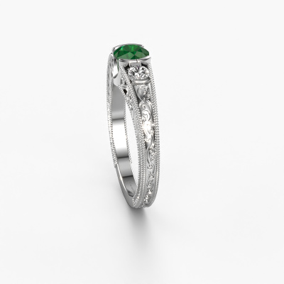 This 14 Carat white gold ring is called Tasia and is set with 5 mm emerald. Is your girlfriend hooked on vintage? Then this white gold filigree promise ring will surely match her style perfectly. A trendy ring with just a hint of vintage adornment. A truly stunning, romantic design! Especially when you customize your ring to your own liking. This vintage 3-stone promise ring is set with stunning emerald. As you can see, you are the boss in selecting a gemstone which matches the style of your girlfriend best. Each gemstone is carefully selected by our merchants whom are spread throughout the world. Nothing but the best gems for our expert goldsmith. After all, it is his crowning glory! Each jewel is made with passion and love by one of our master goldsmiths.By using a combination of the latest modern techniques, combined with ancient crafting, we can make all our promise ring in our own studio. Each jewel is made to order. This is advantageous because we can offer you a price you won't find anywhere else.Our team adds new designs to our online collection daily. Our designers and goldsmiths work together in creating the best design. We strive to offer a diverse collection of jewels. Perhaps you have a specific jewel design in mind. One you came across somewhere. Please contact us for a free consultation. We will make you an offer, based on a fair price/ quality ratio, that will baffle you.To make it easier for you, we offer a 30 day return policy. Check our terms and conditions.