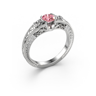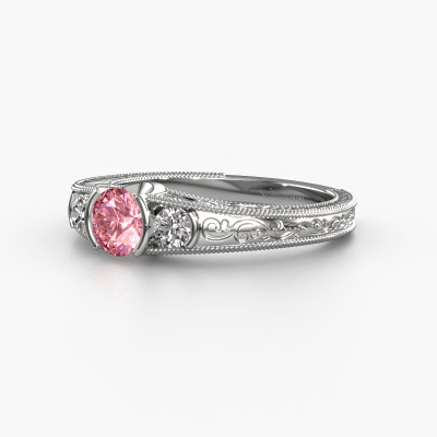 This 14 Carat white gold ring is called Tasia and is set with 5 mm pink lab grown diamond. Is your girlfriend hooked on vintage? Then this white gold filigree promise ring will surely match her style perfectly. A trendy ring with just a hint of vintage adornment. A truly stunning, romantic design! Especially when you customize your ring to your own liking. This vintage 3-stone promise ring is set with stunning pink lab grown diamonds. As you can see, you are the boss in selecting a gemstone which matches the style of your girlfriend best. Each gemstone is carefully selected by our merchants whom are spread throughout the world. Nothing but the best gems for our expert goldsmith. After all, it is his crowning glory! Each jewel is made with passion and love by one of our master goldsmiths.By using a combination of the latest modern techniques, combined with ancient crafting, we can make all our promise ring in our own studio. Each jewel is made to order. This is advantageous because we can offer you a price you won't find anywhere else.Our team adds new designs to our online collection daily. Our designers and goldsmiths work together in creating the best design. We strive to offer a diverse collection of jewels. Perhaps you have a specific jewel design in mind. One you came across somewhere. Please contact us for a free consultation. We will make you an offer, based on a fair price/ quality ratio, that will baffle you.To make it easier for you, we offer a 30 day return policy. Check our terms and conditions.