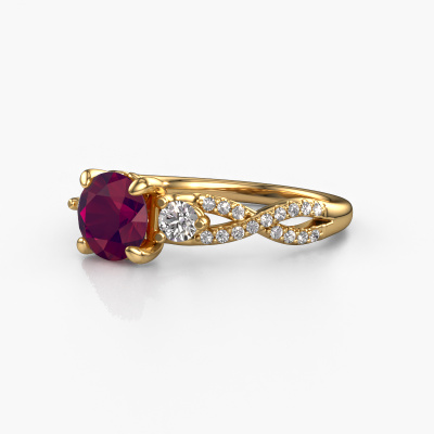 This 14 Carat gold ring is called Marilou RND and is set with 6.5 mm rhodolite. This exclusive gold 3-stone engagement ring is a true work of art! The ornaments are crafted with a lot of patience and great passion. In order to create this ring with great precision, this craft requires a keen eye and skilful hand. A challenge which ignites a fire in our expert goldsmith. The exquisite rhodolite are set in a special way so they stand out even more. This gives the ring an even more glamorous appearance. The split band engagement ring is actually unique on its own because of the gemstones which we carefully select especially for this ring. On top of that you select the precious metals which will be used to create a unique ring for the most extraordinary woman in your life! This jewel is made just for you, with attention to detail and design.Are you on a budget? Please feel free to contact us, so we can go discuss your options. We offer our engagement rings at guaranteed best price, because we make them to order. You won't find such a price anywhere else!Have you found a specific engagement ring somewhere which you would like to give to your loved one? Please feel free to express your wishes to our jewel designers because we would be honoured to turn your design into a fantasy engagement ring. You can follow the development of your ring design because we use 3D drawings. This gives you a realistic preview of how your design will look. You can also preorder a dummy. A dummy is a plastic ring, which can be shaped according your ring design. You can try it on and check if its width and size are suitable for you. We will gladly send you a non-binding offer, based on a fair price/ quality ratio. It will amaze you, considering the quality of the ring and gemstones.To make it easier for you, we offer a 30 day return policy. Check our terms and conditions.