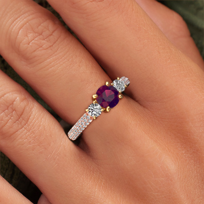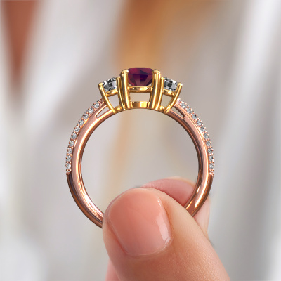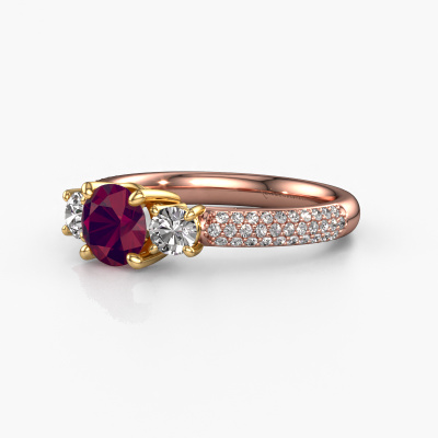 This 14 Carat rose gold ring is called Marielle RND and is set with 6 mm rhodolite. This exclusive rose gold 3-stone engagement ring is a true work of art! The ornaments are crafted with a lot of patience and great passion. In order to create this ring with great precision, this craft requires a keen eye and skilful hand. A challenge which ignites a fire in our expert goldsmith. The exquisite rhodolite are set in a special way so they stand out even more. This gives the ring an even more glamorous appearance. The tasteful engagement ring is actually unique on its own because of the gemstones which we carefully select especially for this ring. On top of that you select the precious metals which will be used to create a unique ring for the most extraordinary woman in your life! This jewel is made with passion and love by one of our master goldsmiths.By using a combination of the latest modern techniques, combined with ancient crafting, we can make all our engagement rings in our own studio. Each jewel is made to order. This is advantageous because we can offer you a price you won't find anywhere else.Our designers and goldsmiths work together each day, creating new jewels. Perhaps you have found a nice exclusive engagement ring somewhere, which can be used to customize your unique ring. Please feel free to contact us. We will make you an offer, based on a fair price/ quality ratio, which will amaze you.To make it easier for you, we offer a 30 day return policy. Check our terms and conditions.