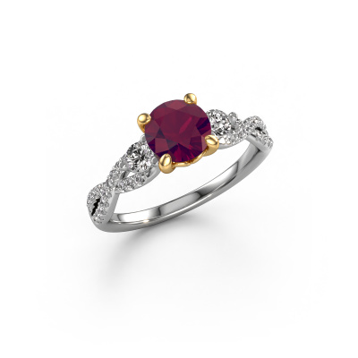 This 14 Carat white gold ring is called Marilou RND and is set with 6.5 mm rhodolite. This exclusive white gold 3-stone engagement ring is a true work of art! The ornaments are crafted with a lot of patience and great passion. In order to create this ring with great precision, this craft requires a keen eye and skilful hand. A challenge which ignites a fire in our expert goldsmith. The exquisite rhodolite are set in a special way so they stand out even more. This gives the ring an even more glamorous appearance. The split band engagement ring is actually unique on its own because of the gemstones which we carefully select especially for this ring. On top of that you select the precious metals which will be used to create a unique ring for the most extraordinary woman in your life! This jewel is made just for you, with attention to detail and design.Are you on a budget? Please feel free to contact us, so we can go discuss your options. We offer our engagement rings at guaranteed best price, because we make them to order. You won't find such a price anywhere else!Have you found a specific engagement ring somewhere which you would like to give to your loved one? Please feel free to express your wishes to our jewel designers because we would be honoured to turn your design into a fantasy engagement ring. You can follow the development of your ring design because we use 3D drawings. This gives you a realistic preview of how your design will look. You can also preorder a dummy. A dummy is a plastic ring, which can be shaped according your ring design. You can try it on and check if its width and size are suitable for you. We will gladly send you a non-binding offer, based on a fair price/ quality ratio. It will amaze you, considering the quality of the ring and gemstones.To make it easier for you, we offer a 30 day return policy. Check our terms and conditions.