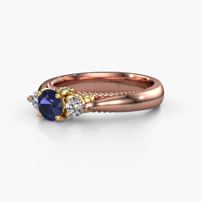 This 14 Carat rose gold ring is called Tiffani and is set with 5 mm sapphire. This exclusive rose gold 3-stone engagement ring is a true work of art! The ornaments are crafted with a lot of patience and great passion. In order to create this ring with great precision, this craft requires a keen eye and skilful hand. A challenge which ignites a fire in our expert goldsmith. The exquisite sapphire are set in a special way so they stand out even more. This gives the ring an even more glamorous appearance. The ajour engagement ring is actually unique on its own because of the gemstones which we carefully select especially for this ring. On top of that you select the precious metals which will be used to create a unique ring for the most extraordinary woman in your life! This jewel is made just for you by our master goldsmiths in our own studio.After receiving your order, our goldsmiths will passionately start the creative process of making your engagement ring in our own studio. Because we don't have a big stockpile, these costs will not be passed on to you. Our pricing is proof of that! We offer top quality jewels at lowest price, guaranteed.Have you found a specific engagement ring somewhere which you would like to give to your loved one? Please feel free to express your wishes to our jewel designers because we would be honoured to turn your design into a unique engagement ring. You can follow the development of your ring design because we use 3D drawings. This gives you a realistic preview of how your design will look. You can also preorder a dummy. A dummy is a plastic ring, which can be shaped according your ring design. You can try it on and check if its width and size are suitable for you. We will gladly send you a non-binding offer, based on a fair price/ quality ratio. It will amaze you, considering the quality of the ring and gemstones.To make it easier for you, we offer a 30 day return policy. Check our terms and conditions.
