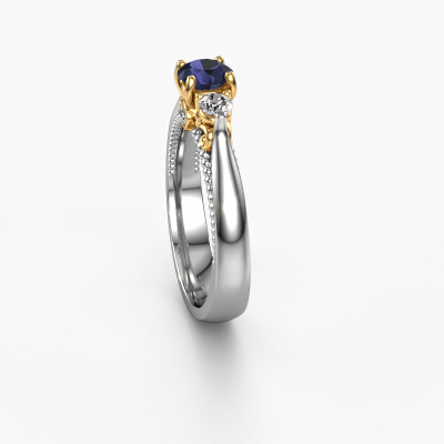 This 14 Carat white gold ring is called Tiffani and is set with 5 mm sapphire. This exclusive white gold 3-stone engagement ring is a true work of art! The ornaments are crafted with a lot of patience and great passion. In order to create this ring with great precision, this craft requires a keen eye and skilful hand. A challenge which ignites a fire in our expert goldsmith. The exquisite sapphire are set in a special way so they stand out even more. This gives the ring an even more glamorous appearance. The ajour engagement ring is actually unique on its own because of the gemstones which we carefully select especially for this ring. On top of that you select the precious metals which will be used to create a unique ring for the most extraordinary woman in your life! This jewel is made just for you by our master goldsmiths in our own studio.After receiving your order, our goldsmiths will passionately start the creative process of making your engagement ring in our own studio. Because we don't have a big stockpile, these costs will not be passed on to you. Our pricing is proof of that! We offer top quality jewels at lowest price, guaranteed.Have you found a specific engagement ring somewhere which you would like to give to your loved one? Please feel free to express your wishes to our jewel designers because we would be honoured to turn your design into a unique engagement ring. You can follow the development of your ring design because we use 3D drawings. This gives you a realistic preview of how your design will look. You can also preorder a dummy. A dummy is a plastic ring, which can be shaped according your ring design. You can try it on and check if its width and size are suitable for you. We will gladly send you a non-binding offer, based on a fair price/ quality ratio. It will amaze you, considering the quality of the ring and gemstones.To make it easier for you, we offer a 30 day return policy. Check our terms and conditions.