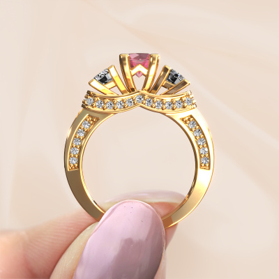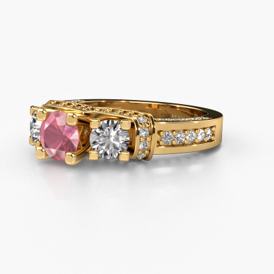 This 14 Carat gold ring is called Phileine and is set with 5 mm tourmaline pink. This exclusive gold 3-stone engagement ring is a true work of art! The ornaments are crafted with a lot of patience and great passion. In order to create this ring with great precision, this craft requires a keen eye and skilful hand. A challenge which ignites a fire in our expert goldsmith. The exquisite tourmaline pink are set in a special way so they stand out even more. This gives the ring an even more glamorous appearance. The daring engagement ring is actually unique on its own because of the gemstones which we carefully select especially for this ring. On top of that you select the precious metals which will be used to create a unique ring for the most extraordinary woman in your life! This jewel is made with passion and love by one of our master goldsmiths.After receiving your order, our goldsmiths will passionately start the creative process of making your engagement ring in our own studio. Because we don't have a big stockpile, these costs will not be passed on to you. Our pricing is proof of that! We offer top quality jewels at lowest price, guaranteed.Different styles of new rings are made daily by our team. Perhaps you have found a 3-stone engagement ring somewhere. One you would like to give to your loved one. Please feel free to share your thoughts and design with our jewel designers. We would love to turn your design into a exclusive engagement ring. You can follow the development of your ring design because we use very detailed 3D drawings. On top of that, you can order a dummy of the design. A dummy is a plastic ring, which can be shaped according your ring design. You can try it on and check if the engagement ring is up to standard. We will gladly send you a non-binding offer, based on a fair price/ quality ratio. The offer will baffle you, considering the quality of the ring and gemstones.To make it easier for you, we offer a 30 day return policy. Check our terms and conditions.