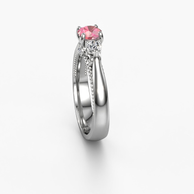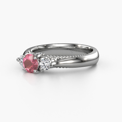 This platinum ring is called Tiffani and is set with 5 mm tourmaline pink. This exclusive platinum 3-stone engagement ring is a true work of art! The ornaments are crafted with a lot of patience and great passion. In order to create this ring with great precision, this craft requires a keen eye and skilful hand. A challenge which ignites a fire in our expert goldsmith. The exquisite tourmaline pink are set in a special way so they stand out even more. This gives the ring an even more glamorous appearance. The ajour engagement ring is actually unique on its own because of the gemstones which we carefully select especially for this ring. On top of that you select the precious metals which will be used to create a unique ring for the most extraordinary woman in your life! This jewel is made just for you by our master goldsmiths in our own studio.After receiving your order, our goldsmiths will passionately start the creative process of making your engagement ring in our own studio. Because we don't have a big stockpile, these costs will not be passed on to you. Our pricing is proof of that! We offer top quality jewels at lowest price, guaranteed.Have you found a specific engagement ring somewhere which you would like to give to your loved one? Please feel free to express your wishes to our jewel designers because we would be honoured to turn your design into a unique engagement ring. You can follow the development of your ring design because we use 3D drawings. This gives you a realistic preview of how your design will look. You can also preorder a dummy. A dummy is a plastic ring, which can be shaped according your ring design. You can try it on and check if its width and size are suitable for you. We will gladly send you a non-binding offer, based on a fair price/ quality ratio. It will amaze you, considering the quality of the ring and gemstones.To make it easier for you, we offer a 30 day return policy. Check our terms and conditions.