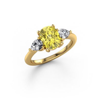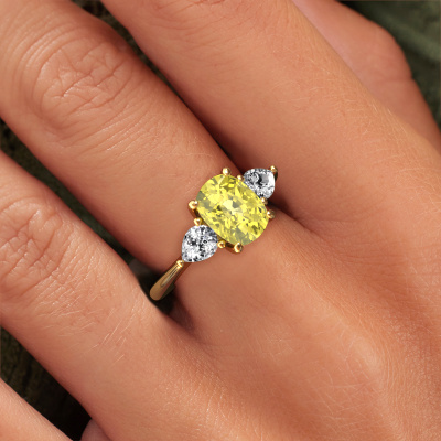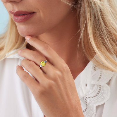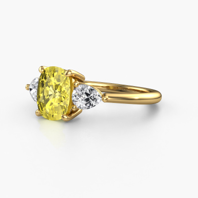 This 14 Carat gold ring is called Chanou CSH and is set with 8.7x6.6 mm yellow lab grown diamond. This exclusive gold 3-stone engagement ring is a true work of art! The ornaments are crafted with a lot of patience and great passion. In order to create this ring with great precision, this craft requires a keen eye and skilful hand. A challenge which ignites a fire in our expert goldsmith. The exquisite yellow lab grown diamonds are set in a special way so they stand out even more. This gives the ring an even more glamorous appearance. The graceful engagement ring is actually unique on its own because of the gemstones which we carefully select especially for this ring. On top of that you select the precious metals which will be used to create a unique ring for the most extraordinary woman in your life! This jewel is made just for you by our master goldsmiths in our own studio.Because we design and deliver our own rings, we can offer you a engagement ring at a price you won't find anywhere else. A ring is made to order, which helps prevent excess supplies, so we can make you a great price offer. We understand it feels risky, buying your engagement ring online, but we will gladly assist in the designing process, taking your budget into consideration.Our team adds new designs to our online collection daily. Our designers and goldsmiths work together in creating the best design. We strive to offer a diverse collection of jewels. Perhaps you have a specific jewel design in mind. One you came across somewhere. Please contact us for a free consultation. We will make you an offer, based on a fair price/ quality ratio, that will baffle you.To make it easier for you, we offer a 30 day return policy. Check our terms and conditions.