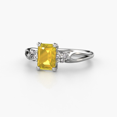 This platinum ring is called Amie EME and is set with 7x5 mm yellow sapphire. This exclusive platinum 3-stone engagement ring is a true work of art! The ornaments are crafted with a lot of patience and great passion. In order to create this ring with great precision, this craft requires a keen eye and skilful hand. A challenge which ignites a fire in our expert goldsmith. The exquisite yellow sapphire are set in a special way so they stand out even more. This gives the ring an even more glamorous appearance. The tasteful engagement ring is actually unique on its own because of the gemstones which we carefully select especially for this ring. On top of that you select the precious metals which will be used to create a unique ring for the most extraordinary woman in your life! This jewel is made to shine bright around your finger. Each jewel is hand made with love by our goldsmiths.Are you on a budget? Please feel free to contact us, so we can go discuss your options. We offer our engagement rings at guaranteed best price, because we make them to order. You won't find such a price anywhere else!Our team adds new designs to our online collection daily. Our designers and goldsmiths work together in creating the best design. We strive to offer a diverse collection of jewels. Perhaps you have a specific jewel design in mind. One you came across somewhere. Please contact us for a free consultation. We will make you an offer, based on a fair price/ quality ratio, that will baffle you.To make it easier for you, we offer a 30 day return policy. Check our terms and conditions.