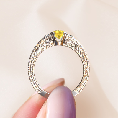 This 14 Carat white gold ring is called Anamaria and is set with 5 mm yellow sapphire. An extraordinary white gold vintage ring. One that will surely make the love of your life shine like a diamond! That is what we hope to achieve. This vintage engagement ring is set with exquisite yellow sapphire. Whichever gemstone you choose from our selection, is up to you. The gemstone is selected with great care because we believe your filigree engagement ring must be adorned with nothing but the most beautiful gemstone. Wouldn't you agree? Our expert goldsmith will design your ring in our own crafting studio, where the yellow sapphire will be set with great precision. The ring will then be polished till it shines perfectly. Nothing but the best for the love of your life! This jewel is made just for you by our master goldsmiths in our own studio.Are you on a budget? Please feel free to contact us, so we can go discuss your options. We offer our engagement rings at guaranteed best price, because we make them to order. You won't find such a price anywhere else!Our team adds new designs to our online collection daily. Our designers and goldsmiths work together in creating the best design. We strive to offer a diverse collection of jewels. Perhaps you have a specific jewel design in mind. One you came across somewhere. Please contact us for a free consultation. We will make you an offer, based on a fair price/ quality ratio, that will baffle you.To make it easier for you, we offer a 30 day return policy. Check our terms and conditions.