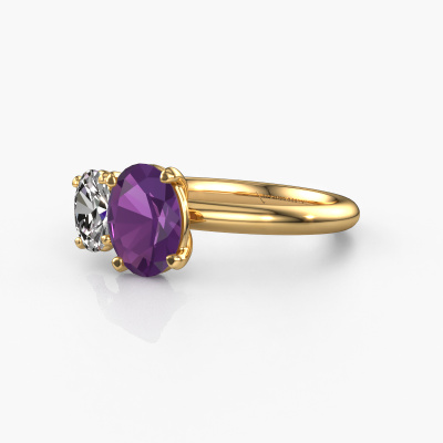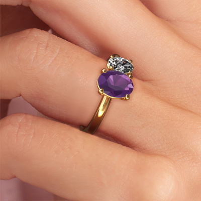 This 14 Carat gold ring is called Toi et Moi OVL-OVL and is set with amethyst. How would you describe the style of the love of your life? Does she have a unique sense of style? This stunning sublime gold engagement ring can be custom-made to your own or her liking. Our amethysten gemstones have been carefully selected because we believe your modern engagement ring must be adorned with nothing but the most beautiful gemstone. Don't you agree? This jewel is made by a team of passionate goldsmiths and jewel designers. This will make your crown jewel truly eye-catching.After receiving your order, our goldsmiths will start the creative process of making your Toi et Moi OVL-OVL engagement ring. We don't keep stock. This is advantageous because these costs will not be passed on to you. Therefore, we can offer jewellery at exceptionally low prices.Different styles of new rings are made daily by our team. Perhaps you have found a 2 stone engagement ring somewhere. One you would like to give to your loved one. Please feel free to share your thoughts and design with our jewel designers. We would love to turn your design into a modern engagement ring. You can follow the development of your ring design because we use very detailed 3D drawings. On top of that, you can order a dummy of the design. A dummy is a plastic ring, which can be shaped according your ring design. You can try it on and check if the engagement ring is up to standard. We will gladly send you a non-binding offer, based on a fair price/ quality ratio. The offer will baffle you, considering the quality of the ring and gemstones.To make it easier for you, we offer a 30 day return policy. Check our terms and conditions.