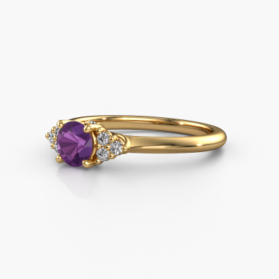 This 14 Carat gold ring is called Felipa RND and is set with 5 mm amethyst. What is it that makes your relationship unique? What is it about her that makes you want to bend down on one knee? The unique bond between the two of you is emphasized by an equally unique ring. A one of a kind ajour 3-stone engagement ring made especially for her. That is why this fantasy ring fits her like a glove. Each specific detail of this ajour gold amethyst set engagement ring is hand-picked, crafted and polished by our expert goldsmith. The result is an exquisite ring, unique and perfectly crafted to perfection. That is what our expert Goldsmiths strive for. This jewel is made just for you by our master goldsmiths in our own studio.After receiving your order, our goldsmiths will passionately start the creative process of making your engagement ring in our own studio. Because we don't have a big stockpile, these costs will not be passed on to you. Our pricing is proof of that! We offer top quality jewels at lowest price, guaranteed.Have you found a specific engagement ring somewhere which you would like to give to your loved one? Please feel free to express your wishes to our jewel designers because we would be honoured to turn your design into a fantasy engagement ring. You can follow the development of your ring design because we use 3D drawings. This gives you a realistic preview of how your design will look. You can also preorder a dummy. A dummy is a plastic ring, which can be shaped according your ring design. You can try it on and check if its width and size are suitable for you. We will gladly send you a non-binding offer, based on a fair price/ quality ratio. It will amaze you, considering the quality of the ring and gemstones.To make it easier for you, we offer a 30 day return policy. Check our terms and conditions.