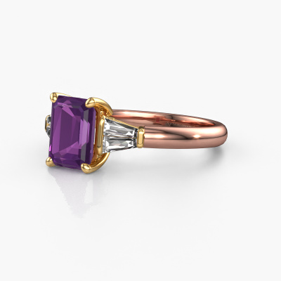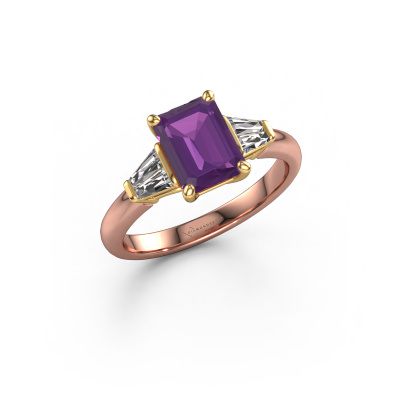 This 14 Carat rose gold ring is called Kina EME and is set with amethyst. How would you describe the style of the love of your life? Does she have a unique sense of style? This stunning special rose gold engagement ring can be custom-made to your own or her liking. Our amethysten gemstones have been carefully selected because we believe your exclusive engagement ring must be adorned with nothing but the most beautiful gemstone. Don't you agree? This jewel is made by a team of passionate goldsmiths and jewel designers. This will make your crown jewel truly eye-catching.Are you on a budget? Please feel free to contact us, so we can go discuss your options. We offer our engagement rings at guaranteed best price, because we make them to order. You won't find such a price anywhere else!Have you found a specific engagement ring somewhere which you would like to give to your loved one? Please feel free to express your wishes to our jewel designers because we would be honoured to turn your design into a exclusive engagement ring. You can follow the development of your ring design because we use 3D drawings. This gives you a realistic preview of how your design will look. You can also preorder a dummy. A dummy is a plastic ring, which can be shaped according your ring design. You can try it on and check if its width and size are suitable for you. We will gladly send you a non-binding offer, based on a fair price/ quality ratio. It will amaze you, considering the quality of the ring and gemstones.To make it easier for you, we offer a 30 day return policy. Check our terms and conditions.