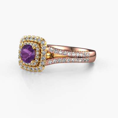 The ring shown above is called the Annette. We call this type of ring a halo ring because it has one centre gemstone and a band that is also pave set with gemstones. The 14 Carat rose gold engagement ring is set with a round 5 mm amethyst centre stone and the band is pave set with diamond gemstones. Each jewel is made just for you by our master goldsmiths in our own studio.This vintage rose gold halo engagement ring has an exquisite round amethyst centre stone. To further accentuate the centre stone, the band is fully set with more diamonds. Its open prong setting allows light to strike the amethyst from various angles and this adds sparkle to your amethyst ring. The photo shown above depicts the goldsmith's carefully handcrafted details of the ring. The high positioning of the centre stone is truly eye-catching. The perfect engagement ring for the crown jewel of your life! After receiving your order, our goldsmiths will passionately start the creative process of making your engagement ring in our own studio. Because we don't have a big stockpile, these costs will not be passed on to you. Our pricing is proof of that! We offer top quality jewels at lowest price, guaranteed.Have you found a specific engagement ring somewhere which you would like to give to your loved one? Please feel free to express your wishes to our jewel designers because we would be honoured to turn your design into a vintage engagement ring. You can follow the development of your ring design because we use 3D drawings. This gives you a realistic preview of how your design will look. You can also preorder a dummy. A dummy is a plastic ring, which can be shaped according your ring design. You can try it on and check if its width and size are suitable for you. We will gladly send you a non-binding offer, based on a fair price/ quality ratio. It will amaze you, considering the quality of the ring and gemstones.To make it easier for you, we offer a 30 day return policy. Check our terms and conditions.