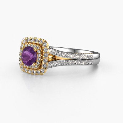 The ring shown above is called the Annette. We call this type of ring a halo ring because it has one centre gemstone and a band that is also pave set with gemstones. The 14 Carat white gold engagement ring is set with a round 5 mm amethyst centre stone and the band is pave set with diamond gemstones. Each jewel is made just for you by our master goldsmiths in our own studio.This vintage white gold halo engagement ring has an exquisite round amethyst centre stone. To further accentuate the centre stone, the band is fully set with more diamonds. Its open prong setting allows light to strike the amethyst from various angles and this adds sparkle to your amethyst ring. The photo shown above depicts the goldsmith's carefully handcrafted details of the ring. The high positioning of the centre stone is truly eye-catching. The perfect engagement ring for the crown jewel of your life! After receiving your order, our goldsmiths will passionately start the creative process of making your engagement ring in our own studio. Because we don't have a big stockpile, these costs will not be passed on to you. Our pricing is proof of that! We offer top quality jewels at lowest price, guaranteed.Have you found a specific engagement ring somewhere which you would like to give to your loved one? Please feel free to express your wishes to our jewel designers because we would be honoured to turn your design into a vintage engagement ring. You can follow the development of your ring design because we use 3D drawings. This gives you a realistic preview of how your design will look. You can also preorder a dummy. A dummy is a plastic ring, which can be shaped according your ring design. You can try it on and check if its width and size are suitable for you. We will gladly send you a non-binding offer, based on a fair price/ quality ratio. It will amaze you, considering the quality of the ring and gemstones.To make it easier for you, we offer a 30 day return policy. Check our terms and conditions.