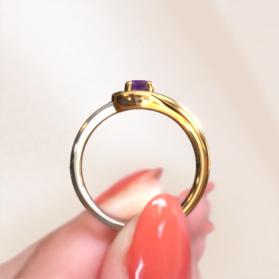 The ring shown above is called the Ceylin, we call this a solitaire ring because it contains a single gemstone. The engagement ring is made in 14 Carat gold and has a round amethyst of 4 mm. The cool thing about our configurator is that you can compile your own piece of jewellery, into a completely personalized one. This solitaire ring is crafted in the precious metals gold with white gold, but of course you are free to pick your own colours. Each piece of jewellery is unique in every way! Simply customize to your liking,The solitaire ring is a special type of engagement ring. Its open prong setting allows light to strike the gemstone from various angles. This fantasy engagement ring is a stunning eye-catcher because of the high positioning of the gemstone. In order for you to commemorate your proposal with a unique ring, we carefully adorn this solitaire ring by hand. The love of your life deserves nothing but the best. Are you on a budget? Please feel free to contact us, so we can go discuss your options. We offer our engagement rings at guaranteed best price, because we make them to order. You won't find such a price anywhere else!Have you found a specific engagement ring somewhere which you would like to give to your loved one? Please feel free to express your wishes to our jewel designers because we would be honoured to turn your design into a fantasy engagement ring. You can follow the development of your ring design because we use 3D drawings. This gives you a realistic preview of how your design will look. You can also preorder a dummy. A dummy is a plastic ring, which can be shaped according your ring design. You can try it on and check if its width and size are suitable for you. We will gladly send you a non-binding offer, based on a fair price/ quality ratio. It will amaze you, considering the quality of the ring and gemstones.To make it easier for you, we offer a 30 day return policy. Check our terms and conditions.