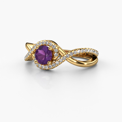 The ring shown above is called the Melody. We call this type of ring a pavé solitaire ring because it has one centre gemstone and a band that is also pave set with gemstones. This engagement ring is made in 14 Carat gold set with a 5 mm round amethyst, and pave set diamonds at the sides. Each piece of jewellery is unique in every way! Simply customize to your likingThis classic gold pavé solitaire engagement ring has an exquisite round amethyst centre stone. To further accentuate the centre stone, the band is set full with more diamonds. Its open prong setting allows light to strike the amethyst from various angles and this adds sparkle to your amethyst ring. The photo shown above depicts the goldsmith's carefully handcrafted details of the ring. The high positioning of the centre stone is truly eye-catching. The perfect engagement ring for the crown jewel of your life!Because we design and deliver our own rings, we can offer you a engagement ring at a price you won't find anywhere else. A ring is made to order, which helps prevent excess supplies, so we can make you a great price offer. We understand it feels risky, buying your engagement ring online, but we will gladly assist in the designing process, taking your budget into consideration.Do you have a specific ring in mind? One you came across somewhere. Please feel free to tell us your wishes and we will turn your design into a unique engagement ring. You can follow the development of your ring design because we use 3D drawings. This gives you a realistic preview of your design. We will gladly send you a non-binding offer, based on a fair price/ quality ratio. It will amaze you.To make it easier for you, we offer a 30 day return policy. Check our terms and conditions.