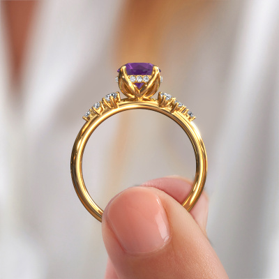 This 14 Carat gold ring is called Emma RND and is set with amethyst. How would you describe the style of the love of your life? Does she have a unique sense of style? This stunning refined gold engagement ring can be custom-made to your own or her liking. Our amethysten gemstones have been carefully selected because we believe your fantasy engagement ring must be adorned with nothing but the most beautiful gemstone. Don't you agree? This jewel is made just for you by our master goldsmiths in our own studio.By using our modern techniques, we can design and customize the finest quality jewels with the utmost care for you. Our engagement rings are always priced 30 percent lower than other jewellers. We make engagement rings to order so we don't have to maintain a large stock. If you have a certain budget, we are more than happy to advice you accordingly.Have you found a specific engagement ring somewhere which you would like to give to your loved one? Please feel free to express your wishes to our jewel designers because we would be honoured to turn your design into a fantasy engagement ring. You can follow the development of your ring design because we use 3D drawings. This gives you a realistic preview of how your design will look. You can also preorder a dummy. A dummy is a plastic ring, which can be shaped according your ring design. You can try it on and check if its width and size are suitable for you. We will gladly send you a non-binding offer, based on a fair price/ quality ratio. It will amaze you, considering the quality of the ring and gemstones.To make it easier for you, we offer a 30 day return policy. Check our terms and conditions.
