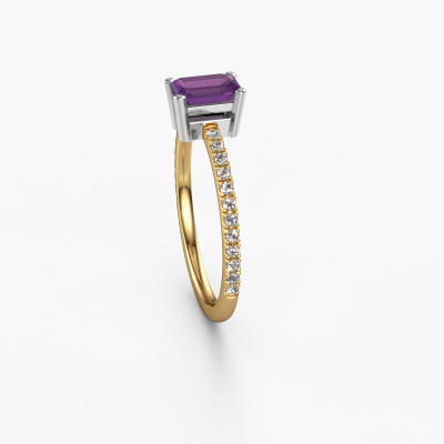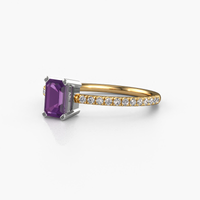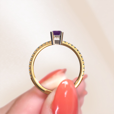 The ring shown above is called the Denita 2 EME. We call this type of ring a pavé solitaire ring because it has one centre gemstone and a band that is also pave set with gemstones. This engagement ring is made in 14 Carat gold set with a 6x4 mm emerald cut amethyst, and pave set diamonds at the sides. Each piece of jewellery is made just for you by our master goldsmiths in our own studio.This traditional gold pavé solitaire engagement ring has an exquisite emerald cut amethyst centre stone. To further accentuate the centre stone, the band is set full with more diamonds. Its open prong setting allows light to strike the amethyst from various angles and this adds sparkle to your amethyst ring. The photo shown above depicts the goldsmith's carefully handcrafted details of the ring. The high positioning of the centre stone is truly eye-catching. The perfect engagement ring for the crown jewel of your life!Are you on a budget? Please feel free to contact us, so we can go discuss your options. We offer our engagement rings at guaranteed best price, because we make them to order. You won't find such a price anywhere else!Our team adds new designs to our online collection daily. Our designers and goldsmiths work together in creating the best design. We strive to offer a diverse collection of jewels. Perhaps you have a specific jewel design in mind. One you came across somewhere. Please contact us for a free consultation. We will make you an offer, based on a fair price/ quality ratio, that will baffle you.To make it easier for you, we offer a 30 day return policy. Check our terms and conditions.