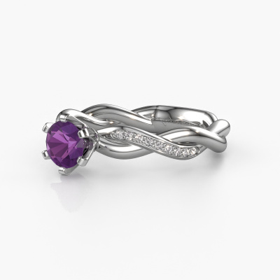 In your eyes, no one else compares to her. She is one in a million, unlike anyone else and pure? These qualities are emphasized perfectly by our fantasy platinum solitaire amethyst ring. This amethyst is carefully selected by our keen artisan goldsmiths. It equals the unique qualities of the love of your life. There is no better way to memorialize your proposal than this symbol of true love. The ring shown above is called the Page, we call this a solitaire ring because it contains a single gemstone. The engagement ring is made in platinum and has a round amethyst of 5.4 mm. Each piece of jewellery is made with passion and love by one of our master goldsmiths.Are you on a budget? Please feel free to contact us, so we can go discuss your options. We offer our engagement rings at guaranteed best price, because we make them to order. You won't find such a price anywhere else!Do you have a specific ring in mind? One you came across somewhere. Please feel free to tell us your wishes and we will turn your design into a unique engagement ring. You can follow the development of your ring design because we use 3D drawings. This gives you a realistic preview of your design. We will gladly send you a non-binding offer, based on a fair price/ quality ratio. It will amaze you.To make it easier for you, we offer a 30 day return policy. Check our terms and conditions.