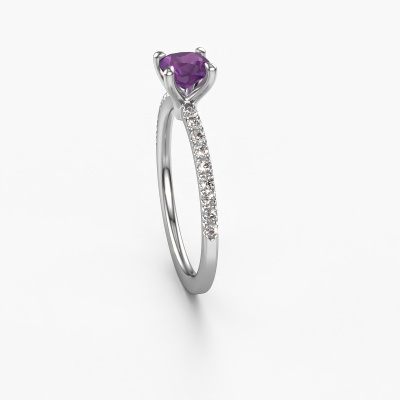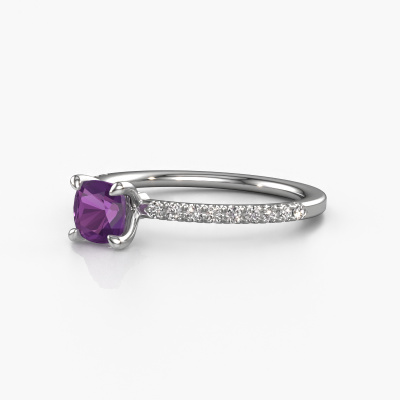 The ring shown above is called the Crystal CUS 2. We call this type of ring a pavé solitaire ring because it has one centre gemstone and a band that is also pave set with gemstones. The platinum engagement ring is set with a cushion 5 mm amethyst centre stone and the band is pave set with diamond gemstones. Each jewel is made just for you by our master goldsmiths in our own studio.This classic platinum pavé solitaire engagement ring has an exquisite cushion amethyst centre stone. To further accentuate the centre stone, the band is fully set with more diamonds. Its open prong setting allows light to strike the amethyst from various angles and this adds sparkle to your amethyst ring. The photo shown above depicts the goldsmith's carefully handcrafted details of the ring. The high positioning of the centre stone is truly eye-catching. The perfect engagement ring for the crown jewel of your life! After receiving your order, our goldsmiths will start the creative process of making your Crystal CUS 2 engagement ring. We don't keep stock. This is advantageous because these costs will not be passed on to you. Therefore, we can offer jewellery at exceptionally low prices.Different styles of new rings are made daily by our team. Perhaps you have found a pavé solitaire engagement ring somewhere. One you would like to give to your loved one. Please feel free to share your thoughts and design with our jewel designers. We would love to turn your design into a classic engagement ring. You can follow the development of your ring design because we use very detailed 3D drawings. On top of that, you can order a dummy of the design. A dummy is a plastic ring, which can be shaped according your ring design. You can try it on and check if the engagement ring is up to standard. We will gladly send you a non-binding offer, based on a fair price/ quality ratio. The offer will baffle you, considering the quality of the ring and gemstones.To make it easier for you, we offer a 30 day return policy. Check our terms and conditions.