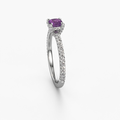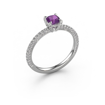 The ring shown above is called the Saskia 2 cus. We call this type of ring a pavé solitaire ring because it has one centre gemstone and a band that is also pave set with gemstones. The platinum engagement ring is set with a cushion 4.5 mm amethyst centre stone and the band is pave set with lab grown diamond gemstones. Each jewel is made just for you, with attention to detail and design.This contemporary platinum pavé solitaire engagement ring has an exquisite cushion amethyst centre stone. To further accentuate the centre stone, the band is fully set with more lab-grown diamonds. Its open prong setting allows light to strike the amethyst from various angles and this adds sparkle to your amethyst ring. The photo shown above depicts the goldsmith's carefully handcrafted details of the ring. The high positioning of the centre stone is truly eye-catching. The perfect engagement ring for the crown jewel of your life! Are you on a budget? Please feel free to contact us, so we can go discuss your options. We offer our engagement rings at guaranteed best price, because we make them to order. You won't find such a price anywhere else!Our designers and goldsmiths work together each day, creating new jewels. Perhaps you have found a nice contemporary engagement ring somewhere, which can be used to customize your unique ring. Please feel free to contact us. We will make you an offer, based on a fair price/ quality ratio, which will amaze you.To make it easier for you, we offer a 30 day return policy. Check our terms and conditions.