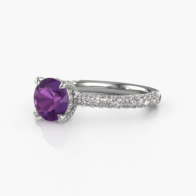 The ring shown above is called the Saskia rnd 2. We call this type of ring a pavé solitaire ring because it has one centre gemstone and a band that is also pave set with gemstones. The platinum engagement ring is set with a round 7 mm amethyst centre stone and the band is pave set with lab grown diamond gemstones. Each jewel is made by a team of passionate goldsmiths and jewel designers. This will make your crown jewel truly eye-catching.This exclusive platinum pavé solitaire engagement ring has an exquisite round amethyst centre stone. To further accentuate the centre stone, the band is fully set with more lab-grown diamonds. Its open prong setting allows light to strike the amethyst from various angles and this adds sparkle to your amethyst ring. The photo shown above depicts the goldsmith's carefully handcrafted details of the ring. The high positioning of the centre stone is truly eye-catching. The perfect engagement ring for the crown jewel of your life! After receiving your order, our goldsmiths will passionately start the creative process of making your engagement ring in our own studio. Because we don't have a big stockpile, these costs will not be passed on to you. Our pricing is proof of that! We offer top quality jewels at lowest price, guaranteed.Our team adds new designs to our online collection daily. Our designers and goldsmiths work together in creating the best design. We strive to offer a diverse collection of jewels. Perhaps you have a specific jewel design in mind. One you came across somewhere. Please contact us for a free consultation. We will make you an offer, based on a fair price/ quality ratio, that will baffle you.To make it easier for you, we offer a 30 day return policy. Check our terms and conditions.
