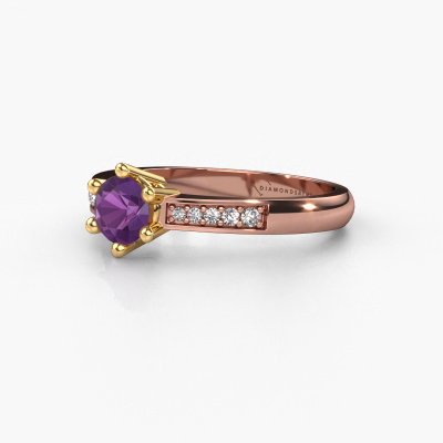 The ring shown above is called the Luna 2. We call this type of ring a pavé solitaire ring because it has one centre gemstone and a band that is also pave set with gemstones. This engagement ring is made in 14 Carat rose gold set with a 5 mm round amethyst, and pave set diamonds at the sides. Each piece of jewellery is unique in every way! Simply customize to your liking,This classic rose gold pavé solitaire engagement ring has an exquisite round amethyst centre stone. To further accentuate the centre stone, the band is set full with more diamonds. Its open prong setting allows light to strike the amethyst from various angles and this adds sparkle to your amethyst ring. The photo shown above depicts the goldsmith's carefully handcrafted details of the ring. The high positioning of the centre stone is truly eye-catching. The perfect engagement ring for the crown jewel of your life!Because we design and deliver our own rings, we can offer you a engagement ring at a price you won't find anywhere else. A ring is made to order, which helps prevent excess supplies, so we can make you a great price offer. We understand it feels risky, buying your engagement ring online, but we will gladly assist in the designing process, taking your budget into consideration.Our team adds new designs to our online collection daily. Our designers and goldsmiths work together in creating the best design. We strive to offer a diverse collection of jewels. Perhaps you have a specific jewel design in mind. One you came across somewhere. Please contact us for a free consultation. We will make you an offer, based on a fair price/ quality ratio, that will baffle you.To make it easier for you, we offer a 30 day return policy. Check our terms and conditions.