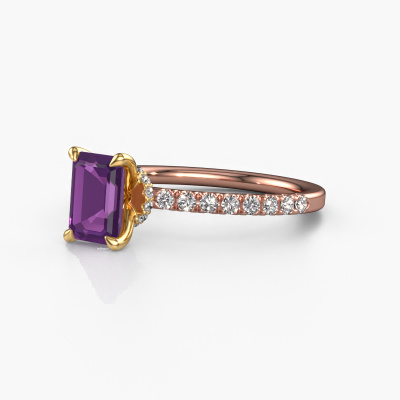 The ring shown above is called the Crystal EME 4. We call this type of ring a pavé solitaire ring because it has one centre gemstone and a band that is also pave set with gemstones. The 14 Carat rose gold engagement ring is set with a emerald cut 7x5 mm amethyst centre stone and the band is pave set with lab grown diamond gemstones. Each jewel is created to add sparkle to your finger, each jewel is lovingly made by hand by our goldsmiths.This fashionable rose gold pavé solitaire engagement ring has an exquisite emerald cut amethyst centre stone. To further accentuate the centre stone, the band is fully set with more lab-grown diamonds. Its open prong setting allows light to strike the amethyst from various angles and this adds sparkle to your amethyst ring. The photo shown above depicts the goldsmith's carefully handcrafted details of the ring. The high positioning of the centre stone is truly eye-catching. The perfect engagement ring for the crown jewel of your life! After receiving your order, our goldsmiths will passionately start the creative process of making your engagement ring in our own studio. Because we don't have a big stockpile, these costs will not be passed on to you. Our pricing is proof of that! We offer top quality jewels at lowest price, guaranteed.Our team adds new designs to our online collection daily. Our designers and goldsmiths work together in creating the best design. We strive to offer a diverse collection of jewels. Perhaps you have a specific jewel design in mind. One you came across somewhere. Please contact us for a free consultation. We will make you an offer, based on a fair price/ quality ratio, that will baffle you.To make it easier for you, we offer a 30 day return policy. Check our terms and conditions.