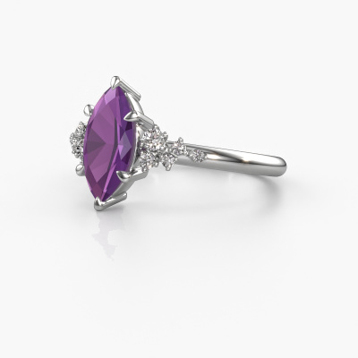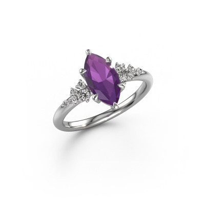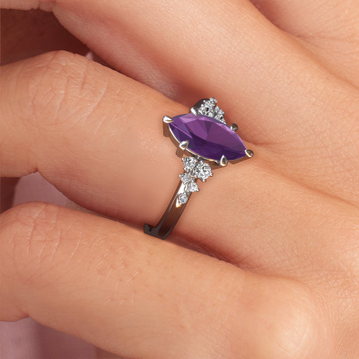The ring shown above is called the Royce MRQ. We call this type of ring a pavé solitaire ring because it has one centre gemstone and a band that is also pave set with gemstones. This engagement ring is made in 14 Carat white gold set with a 11x5.5