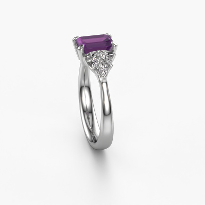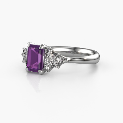 This 14 Carat white gold ring is called Fiona EME and is set with 7x5 mm amethyst. What is it that makes your relationship unique? What is it about her that makes you want to bend down on one knee? The unique bond between the two of you is emphasized by an equally unique ring. A one of a kind special pavé solitaire engagement ring made especially for her. That is why this vintage ring fits her like a glove. Each specific detail of this special white gold amethyst set engagement ring is hand-picked, crafted and polished by our expert goldsmith. The result is an exquisite ring, unique and perfectly crafted to perfection. That is what our expert Goldsmiths strive for. This jewel is created to add sparkle to your finger, each jewel is lovingly made by hand by our goldsmiths.Because we design and deliver our own rings, we can offer you a engagement ring at a price you won't find anywhere else. A ring is made to order, which helps prevent excess supplies, so we can make you a great price offer. We understand it feels risky, buying your engagement ring online, but we will gladly assist in the designing process, taking your budget into consideration.Our team adds new designs to our online collection daily. Our designers and goldsmiths work together in creating the best design. We strive to offer a diverse collection of jewels. Perhaps you have a specific jewel design in mind. One you came across somewhere. Please contact us for a free consultation. We will make you an offer, based on a fair price/ quality ratio, that will baffle you.To make it easier for you, we offer a 30 day return policy. Check our terms and conditions.