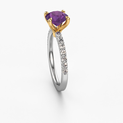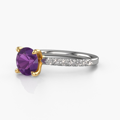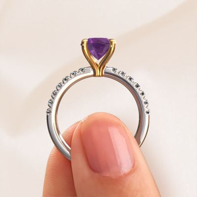 The ring shown above is called the Crystal RND 2. We call this type of ring a pavé solitaire ring because it has one centre gemstone and a band that is also pave set with gemstones. The 14 Carat white gold engagement ring is set with a round 7.3 mm amethyst centre stone and the band is pave set with lab grown diamond gemstones. Each jewel is unique in every way! Simply customize to your liking,This classic white gold pavé solitaire engagement ring has an exquisite round amethyst centre stone. To further accentuate the centre stone, the band is fully set with more lab-grown diamonds. Its open prong setting allows light to strike the amethyst from various angles and this adds sparkle to your amethyst ring. The photo shown above depicts the goldsmith's carefully handcrafted details of the ring. The high positioning of the centre stone is truly eye-catching. The perfect engagement ring for the crown jewel of your life! After receiving your order, our goldsmiths will start the creative process of making your Crystal RND 2 engagement ring. We don't keep stock. This is advantageous because these costs will not be passed on to you. Therefore, we can offer jewellery at exceptionally low prices.Different styles of new rings are made daily by our team. Perhaps you have found a pavé solitaire engagement ring somewhere. One you would like to give to your loved one. Please feel free to share your thoughts and design with our jewel designers. We would love to turn your design into a classic engagement ring. You can follow the development of your ring design because we use very detailed 3D drawings. On top of that, you can order a dummy of the design. A dummy is a plastic ring, which can be shaped according your ring design. You can try it on and check if the engagement ring is up to standard. We will gladly send you a non-binding offer, based on a fair price/ quality ratio. The offer will baffle you, considering the quality of the ring and gemstones.To make it easier for you, we offer a 30 day return policy. Check our terms and conditions.