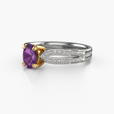 The ring shown above is called the Antonia ovl 2. We call this type of ring a pavé solitaire ring because it has one centre gemstone and a band that is also pave set with gemstones. The 14 Carat white gold engagement ring is set with a oval 7x5 mm amethyst centre stone and the band is pave set with diamond gemstones. Each jewel is unique in every way! Simply customize to your liking,This contemporary white gold pavé solitaire engagement ring has an exquisite oval amethyst centre stone. To further accentuate the centre stone, the band is fully set with more diamonds. Its open prong setting allows light to strike the amethyst from various angles and this adds sparkle to your amethyst ring. The photo shown above depicts the goldsmith's carefully handcrafted details of the ring. The high positioning of the centre stone is truly eye-catching. The perfect engagement ring for the crown jewel of your life! By using a combination of the latest modern techniques, combined with ancient crafting, we can make all our engagement rings in our own studio. Each jewel is made to order. This is advantageous because we can offer you a price you won't find anywhere else.Our team adds new designs to our online collection daily. Our designers and goldsmiths work together in creating the best design. We strive to offer a diverse collection of jewels. Perhaps you have a specific jewel design in mind. One you came across somewhere. Please contact us for a free consultation. We will make you an offer, based on a fair price/ quality ratio, that will baffle you.To make it easier for you, we offer a 30 day return policy. Check our terms and conditions.
